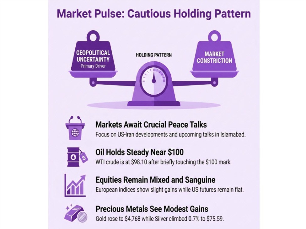 Oil prices are consolidating near $98/barrel ahead of US-Iran peace negotiations scheduled for this weekend in Islamabad, with WTI briefly touching $100 earlier in the session. For Asian investors, the outcome of these talks directly impacts oil costs (affecting energy stocks and import-dependent economies like Singapore) and broader risk appetite—a failed negotiation could push crude sharply higher. Watch for weekend headlines on the talks; any breakthrough may ease geopolitical premium in oil and support equities, while stalled progress could trigger volatility in energy stocks and currencies tied to risk sentiment.